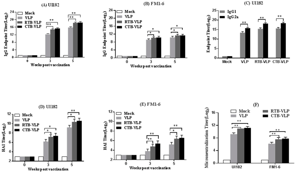 We next determined the HAI activity of sera collected 0, 3, and 5 weeks after primary immunization with VLPs, CTB-VLPs, or RTB-VLPs. Immunization with CTB-VLPs (1638) or RTB-VLPs (1434) elicited significantly higher HAI antibody titers against mouse-adapted UI182 virus when compared with titers achieved following immunization with VLPs (614) alone at both 3 and 5 weeks (Figure 2D). HAI antibody titers increased between weeks 3 and 5, irrespective of the VLP vaccine composition (Figure 2D). Further, mice immunized with CTB-VLPs (102) or RTB-VLPs (89) generated significantly higher cross-reactive HAI antibody titers against mouse-adapted FM1-6 virus when compared with titers achieved following immunization with VLPs (38) alone at both 3 and 5 weeks (Figure 2E).
