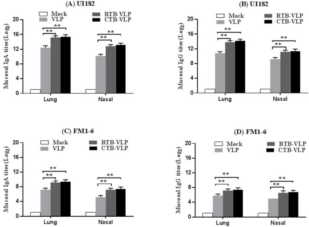 Respiratory mucosal surfaces are the natural route of entry and the primary replication site of influenza virus. We therefore performed ELISAs to evaluate the levels of mucosal secretory IgA and IgG antibodies in lung and nasal washes collected from immunized mice 4 days following challenge with 10 MLD50 UI182 or FM1-6 virus. Lung and nasal washes collected from mice immunized with CTB-VLPs or RTB-VLPs contained significantly higher titers of UI182 virus-specific IgA and IgG when compared with washes collected from mice immunized with VLPs alone (Figure 3A,B). When the lung and nasal washes were assessed for antibody cross-reactivity against the FM1-6 virus, lower titers were seen when compared with the homologous UI182 virus, though mice vaccinated with CTB-VLPs or RTB-VLPs still exhibited significantly higher IgA and IgG titers when compared with mice vaccinated with VLPs alone (Figure 3C,D). These results demonstrate that immunization with cVLPs containing membrane-anchored RTB or CTB significantly enhance mucosal immune responses.