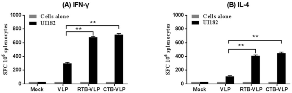 We next evaluated the patterns of T cell cytokine production following vaccination with VLPs, CTB-VLPs, or RTB-VLPs. Splenocytes harvested from immunized mice 4 days post-challenge with 10 MLD50 UI182 virus were restimulated with inactivated UI182 virus to enumerate the frequency of IFN-γ and IL-4-secreting cells by ELISpot (Figure 4A,B). Mice immunized with RTB-VLPs or CTB-VLPs had a significantly higher frequency of IFN-γ- and IL-4-secreting cells when compared with mice immunized with VLPs alone (p < 0.01), revealing antigen-specific Th1 and Th2 subpopulations of helper T cells. Consistent with the higher titers of virus-specific IgG2a compared to those of IgG1, cells secreting IFN-γ upon restimulation were recovered at a higher frequency than IL-4 secreting cells in all groups, demonstrating a Th1-dominant response. These results suggest that cVLPs containing membrane-anchored RTB or CTB enhance the magnitude of the cellular responses following immunization.