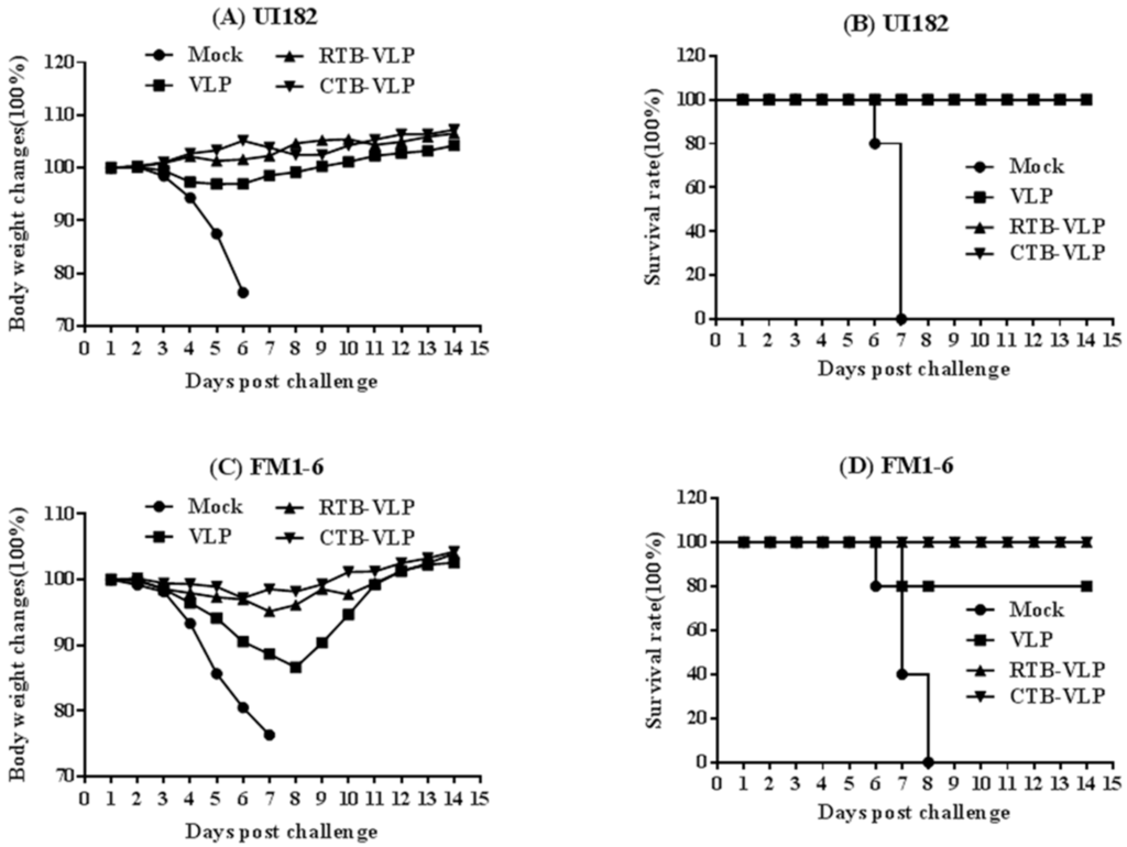 Protein concentrations of purified influenza VLPs and cVLPs were analysed using a BCA assay kit (Thermo). Female BALB/c mice aged 6–8 weeks (Changchun Animal Breeding Center for Medical Research, Changchun, China) were immunized intranasally two times at 2-week intervals with 0.2 mL containing 10 µg (27 HA units) VLPs, CTB-VLPs or RTB-VLPs. As a mock immunization control, mice were immunized with PBS alone. Two weeks following the booster immunization (week 5 of immunization schedule), the mice were anesthetized with isoflurane and intranasally infected with 10 MLD50 of mouse-adapted UI182 or FM1-6 in 50 µL of PBS. The body weights and survival were monitored daily. Mice losing >25% of their starting body weight were considered moribund and were euthanized according to predetermined endpoints set by the Institutional Animal Care and Use Committee (IACUC). All animal experiments were performed in accordance with the ethical guidelines of the International Association for the Study of Pain and were approved by the Animal Care and Use Committee of the Chinese People’s Liberation Army (No:SYXK2009-045).