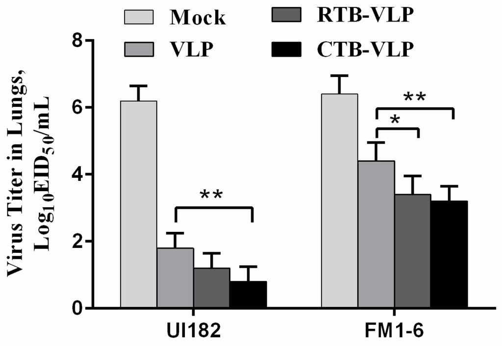 As an additional measure of vaccine efficacy, lung viral loads were measured 4 days post-challenge with 10 MLD50 homologous UI182 or heterologous FM1-6 viruses. As expected, the mock-immunized mice displayed high titers of both UI182 and FM1-6 in the lungs at 4 days post-challenge relative to mice immunized with VLPs, RTB-VLPs, or CTB-VLPs (Figure 6). The VLP-based immunization of mice resulted in marked reductions in viral loads relative to mock-immunized mice when challenged with either UI182 virus or FM1-6 virus, though the reduction in viral load was more pronounced in immunized mice challenged with the homologous UI182 virus (Figure 6). Mice immunized with VLPs containing membrane-anchored CTB displayed significantly lower lung viral titers of both UI182 and FM1-6 when compared with mice immunized with VLPs alone, whereas immunization with RTB-VLPs resulted in significantly lower viral loads only following challenge with the FM1-6 virus (Figure 6). When challenged with FM1-6 virus, lung viral loads were reduced 10-fold and 15-fold in mice immunized with RTB-VLPs and CTB VLPs, respectively, relative to mice immunized with VLPs alone (Figure 6). These results indicate that cVLPs containing membrane-anchored RTB or CTB resulted in improved viral control following homologous and heterologous virus challenges.