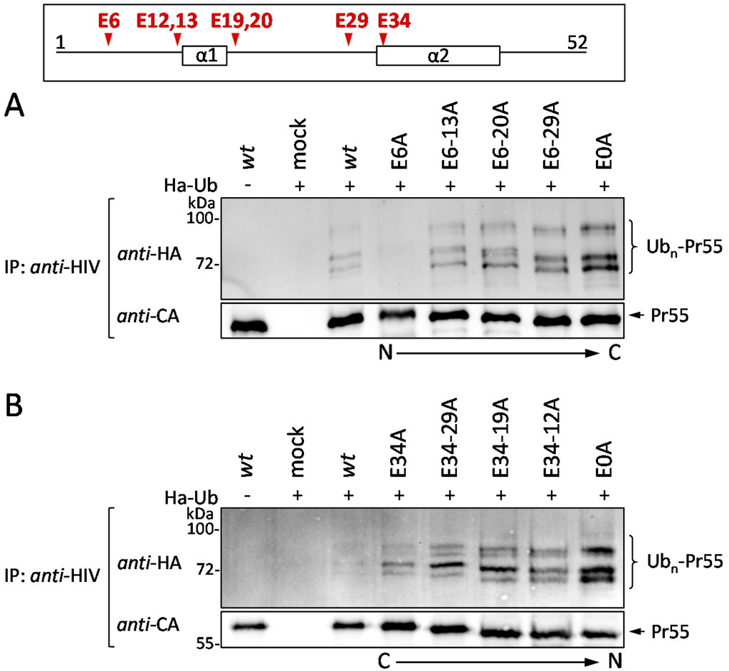 Successive mutation of the glutamic acids in p6 gradually increases HIV-1 Gag ubiquitination. (A,B) HeLa cells were co-transfected with HA-tagged ubiquitin and pNLenv1 expression plasmids as indicated. Gag was immunoprecipitated from whole cell lysates using anti-HIV antibodies and Gag ubiquitination was detected by western blot stained for HA. The amount of precipitated Gag was detected by anti-CA staining.