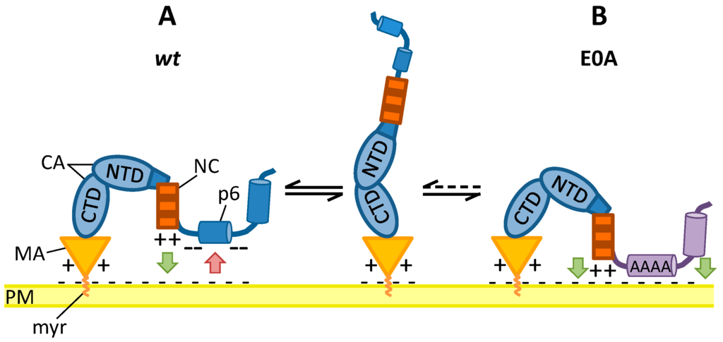 Furthermore, it has been reported by others that the Pr55 Gag precursor undergoes a major conformational change during assembly [76,77,78]. In these studies, it was proposed that Gag was compact in solution with MA and NC in close proximity. Once MA anchors Gag to the plasma membrane, NC is also able to associate with the membrane via electrostatic interactions [77]. Upon binding of the viral RNA to NC and binding of Gag to the plasma membrane via MA, Gag is extended to its final conformation and this might be further stabilized by interprotein interactions [77]. Nevertheless, in these studies the authors used a Gag protein lacking the C-terminal p6 domain [76,77,78]. Membrane flotation assays using the complete Pr55 Gag protein now demonstrate enhanced membrane binding of Gag after mutation of Glu residues in p6. We propose a hypothetical model by which in the wt situation the Glu residues within p6 contribute to the extended shape of Gag through repulsion from the plasma membrane via their negative charges (Figure 10A). In consistency with this hypothesis is the finding that NC alone displays a strong interaction with the plasma membrane [79]. Ala substitution of all basic residues in NC significantly decreased membrane association of Gag [80]. Furthermore, it has been demonstrated that the p6 domain in the context of NCp15 folds back to the NC and interacts with the basic zinc fingers [81,82]. Conceivably, the nine negatively charged amino acids within p6, seven of which are constituted of Glu residues, are necessary to prevent prolonged binding of NC to the membrane via its basic residues, by counteracting its positive net charge.