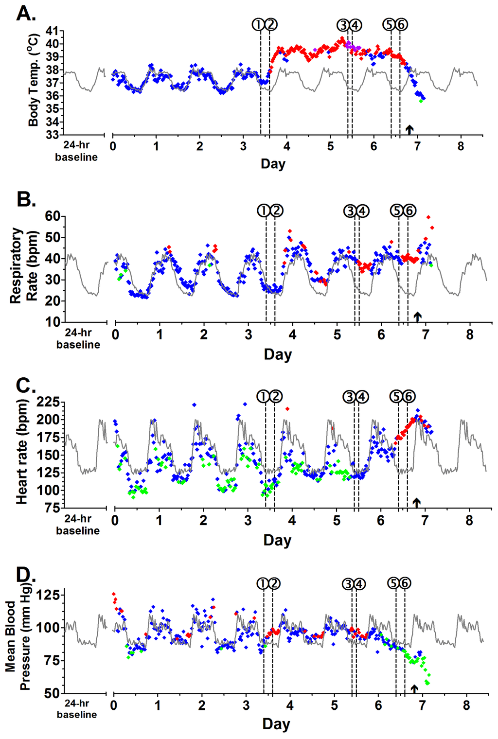 Running plot of body temperature, respiratory rate, heart rate, and blood pressure for Subject 2. (A) Body temperature values displaying normal (), fever (), hyperpyrexia (), and hypothermia (); (B) Respiratory rate; (C) Heart rate; (D) Blood pressure. Values + 3 SD () or − 3 SD () from baseline were considered statistically significant; Values <3 SD () were not significant. Baseline values are seen in gray (–). Circled numbers indicate start of significant response for temperature (1), fever (2), hyperpyrexia (3), respiratory rate (4), heart rate (5), and blood pressure (6). A arrow (↑) marks the time when macaque was anesthetized with ketamine (10 mg/kg) for blood draw.