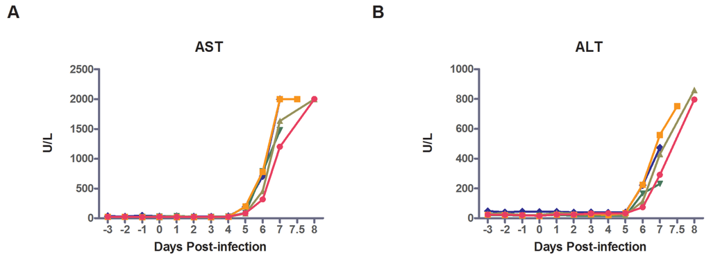 Viremia was assessed using both a standard plaque assay from plasma and quantitative RT-PCR on subject serum (Table 1, Figure S1). Plaque assay counts revealed first detectable viremia on day PID 4, which continued to rise until peaking on PID 6 or 7. However, daily plaque counts are not available for all subjects due to limited plasma samples. The RT-PCR results closely adhered to plaque assay curves for all subjects. All 5 macaques had detectable levels of MARV-Ang by PID 4, correlating with the onset of fever (Figure S2), but preceding clinical observations of disease. Viral load in all macaques clustered tightly together, and peaked on PID 7, with levels around 108 pfu/mL. For the 3 animals that survived to PID 8, their viral load plateaued (2/3) and decreased (1/3). Unsurprisingly, increased viral burden was observed with concomitant worsening clinical signs, elevated liver enzymes, decreased WBC count, and increase of pro-inflammatory mediators.