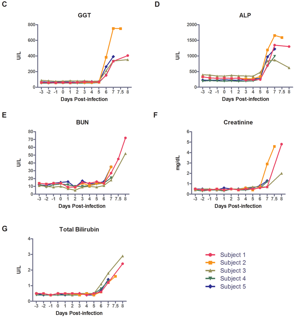 Analysis of blood gases using an iStat CG4+ cartridge revealed changes in pH, PCO2, and lactate, with first deviations from baseline noted on PID 7 (Figure S9). Increasing levels of lactate were associated with decrease in serum pH, consistent with a metabolic acidosis, which was most marked in Subject 2. A concomitant decrease in PCO2 accompanied increasing respiratory rate, indicative of the normal physiology compensatory mechanism to maintain acid-base homeostasis. Interestingly, other blood gas parameters including PO2, and HCO3 showed little or no deviation from baseline values (Figure S9).