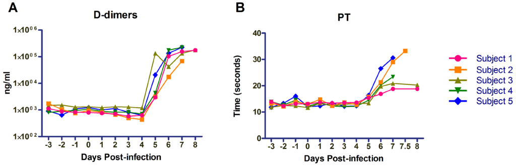 Since coagulopathy is a well-known hallmark of filoviral hemorrhagic fevers, a PT/INR coagulation cartridge was used to measure the functionality of the extrinsic coagulation pathway throughout the course of the disease. Additionally, D-dimer levels were also drawn to measure fibrin degradation as an indicator of DIC. The results in Figure 3 demonstrate the onset of coagulation abnormalities beginning on PID 6. Continued increases in D-dimer levels and PT times were seen in Subjects 2, 4, and 5 from Day 6 to death or euthanasia, while Subjects 1 and 3 PT values remain stable on PIDs 7 and 8. All macaques showed elevations in D-dimer levels from baseline values starting on PID 4 or 5, with elevations throughout disease course ranging between 50 and 200-fold over baseline values.