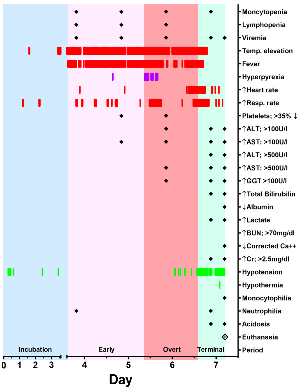 Example of summary of significant physiologic and laboratory findings, here from Subject 2. A red line () indicates significant elevation from baseline for physiologic data during the 30-min interval average as +3 SD from baseline values for heart rate and respiratory rate, or 1.5 °C (for fever only). A purple () indicates hyperpyrexia (>3 °C above baseline values). A green line () indicates +3 SD decline in blood pressure from baseline value for that 30-min interval average. Viremia is defined as presence of viral RNA in blood. AST = Aspartate aminotransferase. ALT = Alanine aminotransferase. GGT = Gamma glutamyltransferase. ↓ Albumin defined as 20% reduction in baseline values. ↑ Lactate defined as level about 5 mmol/L. BUN = blood urea nitrogen. ↓ Corrected Ca2+ defined as below 8.0 mg/dL. Cr = creatinine. Neutrophilia is defined as a 100% increase in baseline values. Lymphopenia is defined as 50% reduction below baseline values. Incubation period (blue) defined as time of challenge to onset of sustained fever response (>1.5 °C above baseline for 2-h). Early clinical period (light pink) defined as onset of sustained fever to onset of sustained tachycardia or tachypnea (+3 SD above baseline values). Overt clinical period (dark pink) defined as onset of sustained tachycardia or tachypnea until onset of sustained hypotension (+3 SD decline in blood pressure from baseline values). Terminal period (green) defined as onset of sustained hypotension until death or euthanasia.