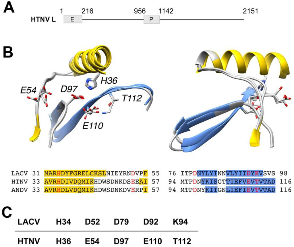 Model of the putative active sites of prototypic Hantaan virus (HTNV) and Andes (ANDV) superposed on the active site of orthobunyavirus La Crosse (LACV). (A) Schematic representation of HTNV L protein. The L segment of the prototypic HTNV strain 76/118 has 6533 nucleotides and encodes the L protein of 2151 amino acids (aa). HTNV L contains a polymerase (P) domain (aa 956–1142) and a putative endonuclease (E) domain (aa 1–216). (B) Models of the putative active sites of HTNV and ANDV superposed on the active site of LACV. Ribbon diagrams of LACV (PDB entry 2XI5), HTNV and ANDV after structural superposition of key active site residues. Secondary structure classifications was calculated using definition of secondary structure proteins (DSSP) [33] for LACV or predicted using the method/program PSI-PRED [34]. Helix residues have been colored yellow and β-strand residues have been colored blue in the ribbon diagrams as well as in the alignment, according to DSSP or PSI-PRED results, respectively. Annotations in ribbon diagrams follow the HTNV residue numbering in the alignment. Key residues are colored red in the alignment and shown with side chains in the ribbon diagrams. The ribbon diagrams to the right have been rotated 90 degrees around the vertical coordinate axis. (C) Amino acid residues of the active site of HTNV L endonuclease derived from the model in (A).