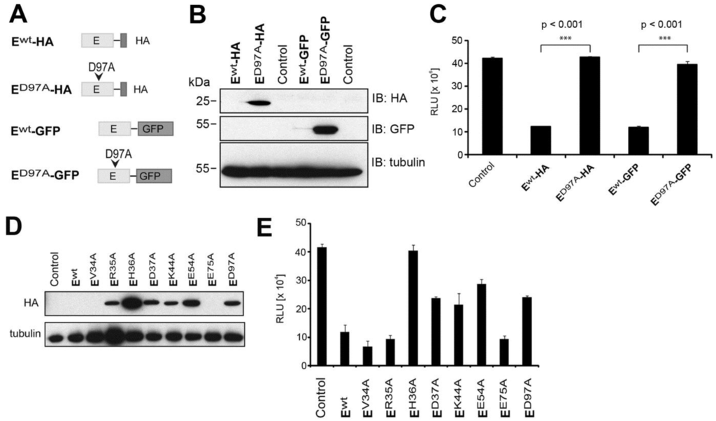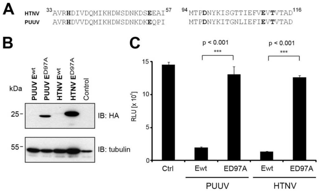 Next, we subjected HTNV E-HA to site directed mutagenesis performing alanine replacement of additional residues predicted to be located within or close to the putative active site. Specifically, we mutated residues H36, V34, R35, D37, E54, and the previously identified residues K44 [25] and E75 [24,32]. Examination by Western blot revealed that mutations V34A and E75A hardly increased protein expression, suggesting intact endonuclease activity (Figure 2D). In contrast, mutations R35A, H36A, D37A, K44A, E54A, and D97A resulted in at least partial rescue of protein expression, indicating reduced endonuclease activity (Figure 2D). Co-expression of mutants and wild-type HTNV E-HA with the NLuc expression plasmid resulted in reporter activities that correlated with the expression levels of the HTNV E-HA variants (Figure 2D,E).