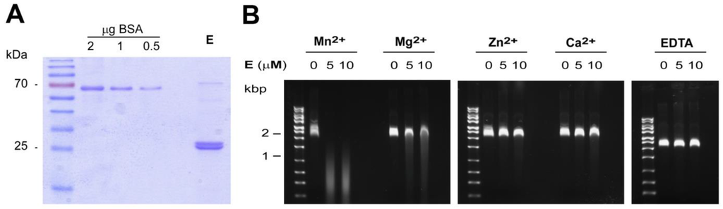 For nuclease experiments, 5 to 10 μM of the purified protein were incubated with 25 ng/μL single stranded M13 mp18 DNA (Bayou Biolabs, Metairie, LA, USA) in 20 mM Tris-HCl pH 8.0, 150 mM NaCl, 2.5 mM β-mercaptoethanol and at 37 °C for 60 min. Divalent cations were added to a 2 mM concentration. As a control, the reaction was performed in EDTA 20 mM.