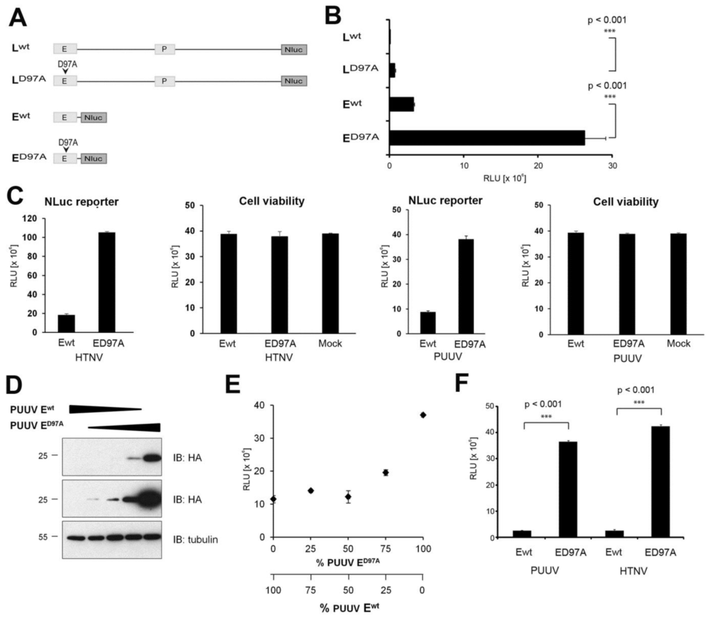 Development of a cell-based assay for endonuclease activity. (A) Schematic representation of the constructs. Full-length L protein wt and D97A mutant, as well as the endonuclease domain (E) wt and D97A mutant were fused to NLuc at the C-terminus. (B) The constructs were expressed in BSR T7/5 cells. Cells were lyzed 48 h post-transfection and NLuc activity measured using the Nano Glow® Luciferase Assay System (Promega). Data represent mean ± SD (n = 3) and were analyzed by one-way ANOVA. One representative experiment out of three is shown. (C) Cell viability assay. The indicated NLuc fusion constructs were transfected into BSR T7/5 cells. After 24 h, NLuc reporter activity was measured as in (B). Cell viability was assessed by Cell TiterGlo® assay. Data represent mean ± SD (n = 3). (D) Different relative amounts of PUUV Ewt-HA and PUUV ED97A-HA were co-transfected into BSR T7/5 cells. At 24 h post transfection, protein expression was detected in Western blot as in Figure 2B. (E) Different relative amounts of PUUV Ewt-NLuc and PUUV ED97A-NLuc were co-transfected into BSR T7/5 cells and NLuc reporter activity detected after 24 h as in (B). Data represent mean ± SD (n = 3). (F) PUUV Ewt and HTNV Ewt and the corresponding D97A mutants were fused to NLuc at the C-terminus. All constructs were expressed as in (B). Cells were lyzed 24 h post-transfection and NLuc activity measured. Data represent mean ± SD (n = 3) and were analyzed by one-way ANOVA with p-values indicated. One representative experiment out of three is shown.