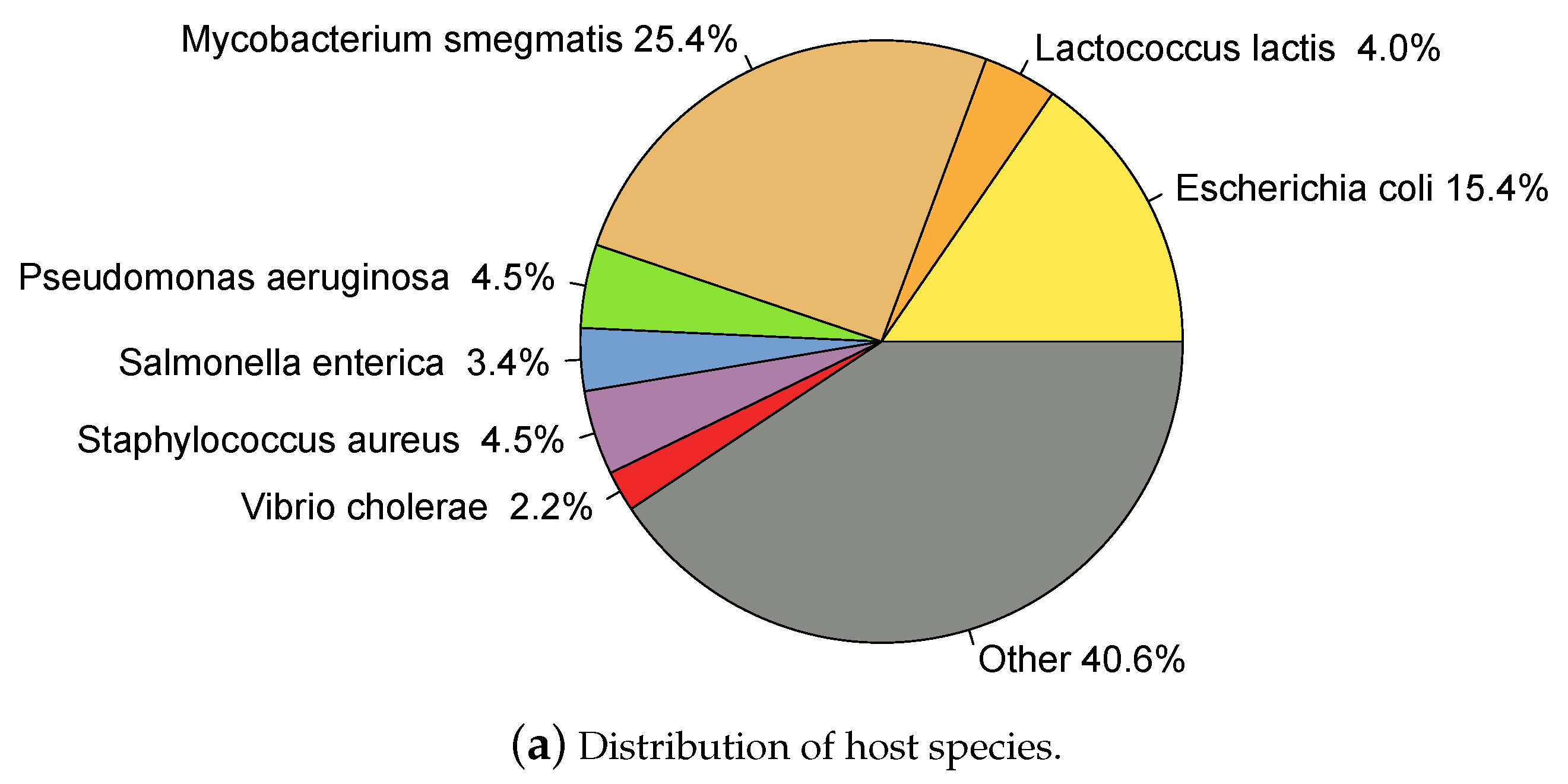Only entries indicating "complete genome" in the DEFINITION field of the GeneBank file and which host taxonomy was specified at least at the genus level were included. Entries annotated as "prophage" in the DEFINITION were removed. Hosts annotated as Salmonella Typhimurium were re-annotated as Salmonella enterica according to current nomenclature [47]. Finally, only the genus was taken into account for hosts with species specified as "sp." followed by an alphanumeric code; for example Synechococcus sp. WH7803 was re-annotated as Synechococcus. 2196 phages had annotated host genus, here called dataset, and of these, 1871 had annotated species as well, . A total of 209 different host species and 129 different genera were represented among the phages (this data is available in HostPhinder’s repository [48]). Figure 1 shows the distribution of hosts in the dataset.