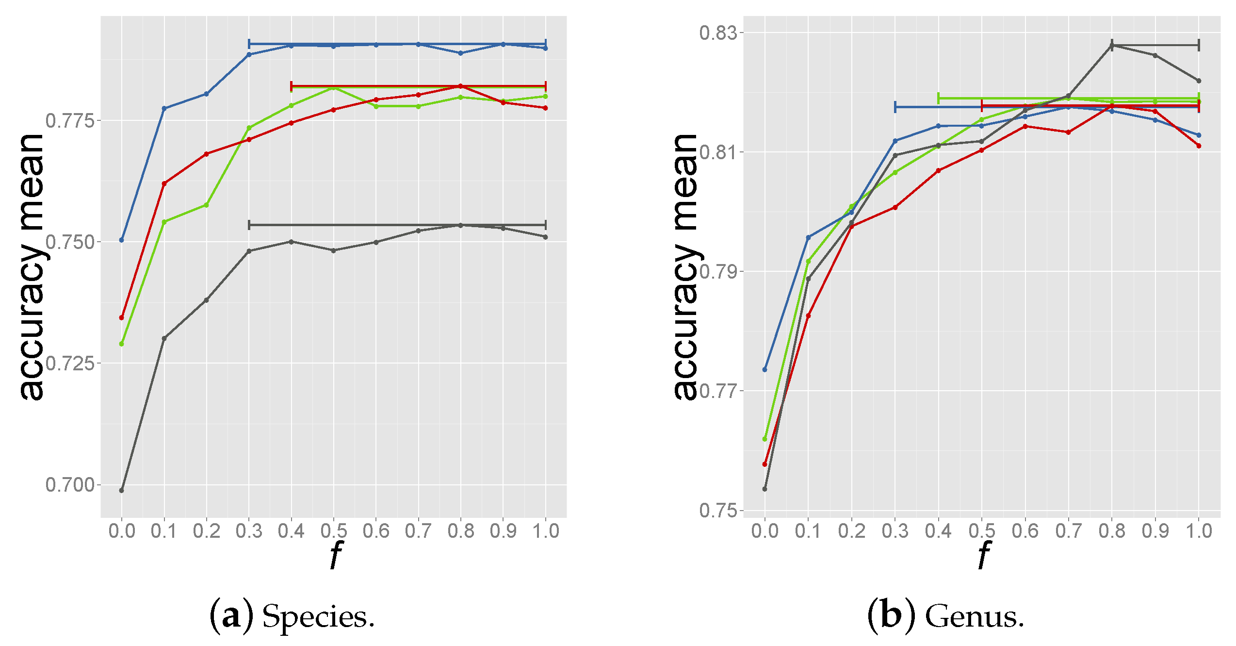 Accuracy vs. f values obtained from the 4 loops of inner cross validation. Each dot represents the averaged accuracy for species (a) and genus (b) prediction over 100 bootstrap resamplings. The bars cover the range of f values for which the accuracy is 99% the highest accuracy in the specific tripartite set.
