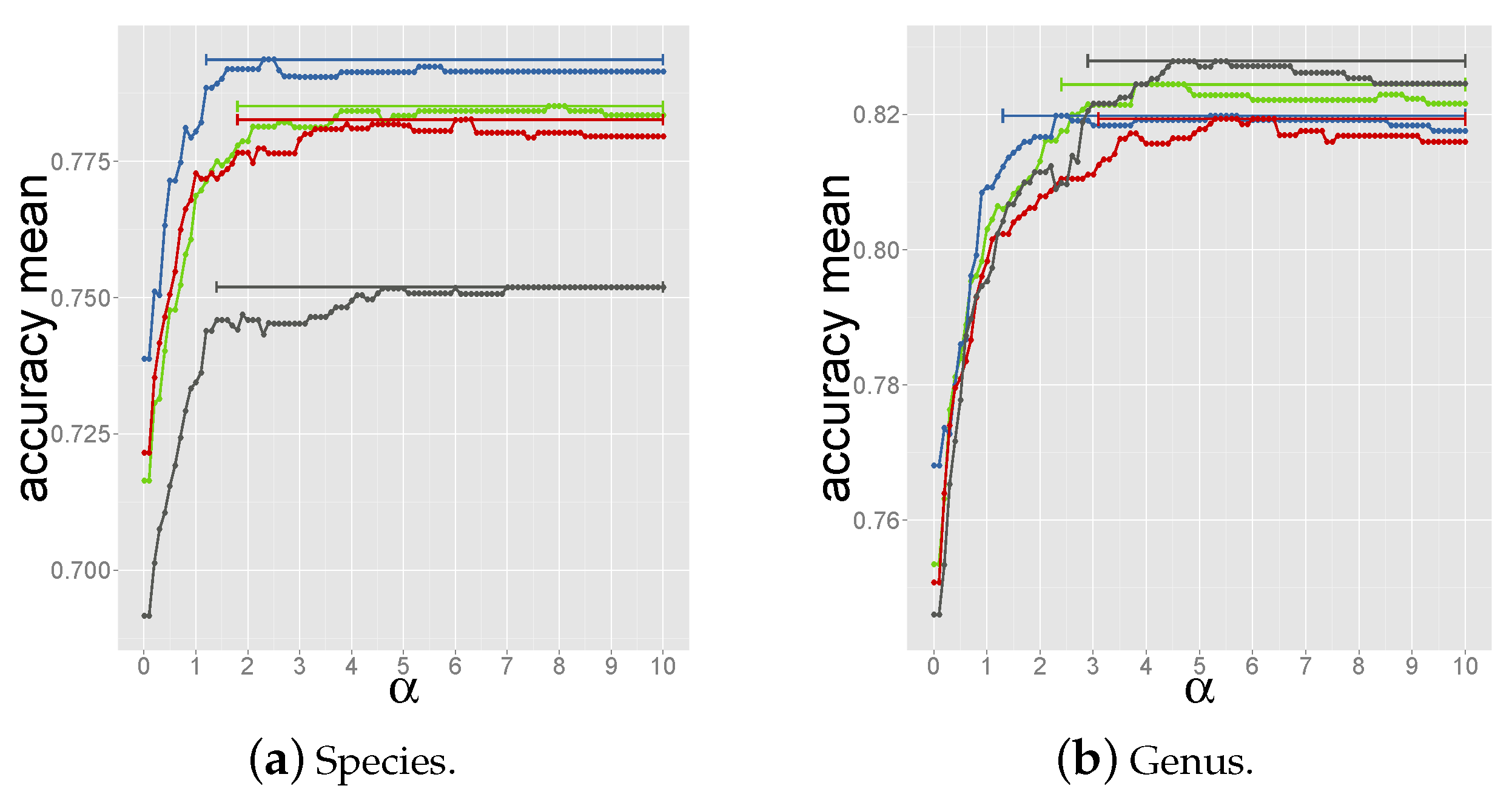Accuracy vs. α values for prediction of species (a) and genus (b) in each tripartite set. Each dot represents the averaged accuracy over 100 bootstrap resamplings. The bars cover the range of α values for which the accuracy is 99% the highest accuracy.