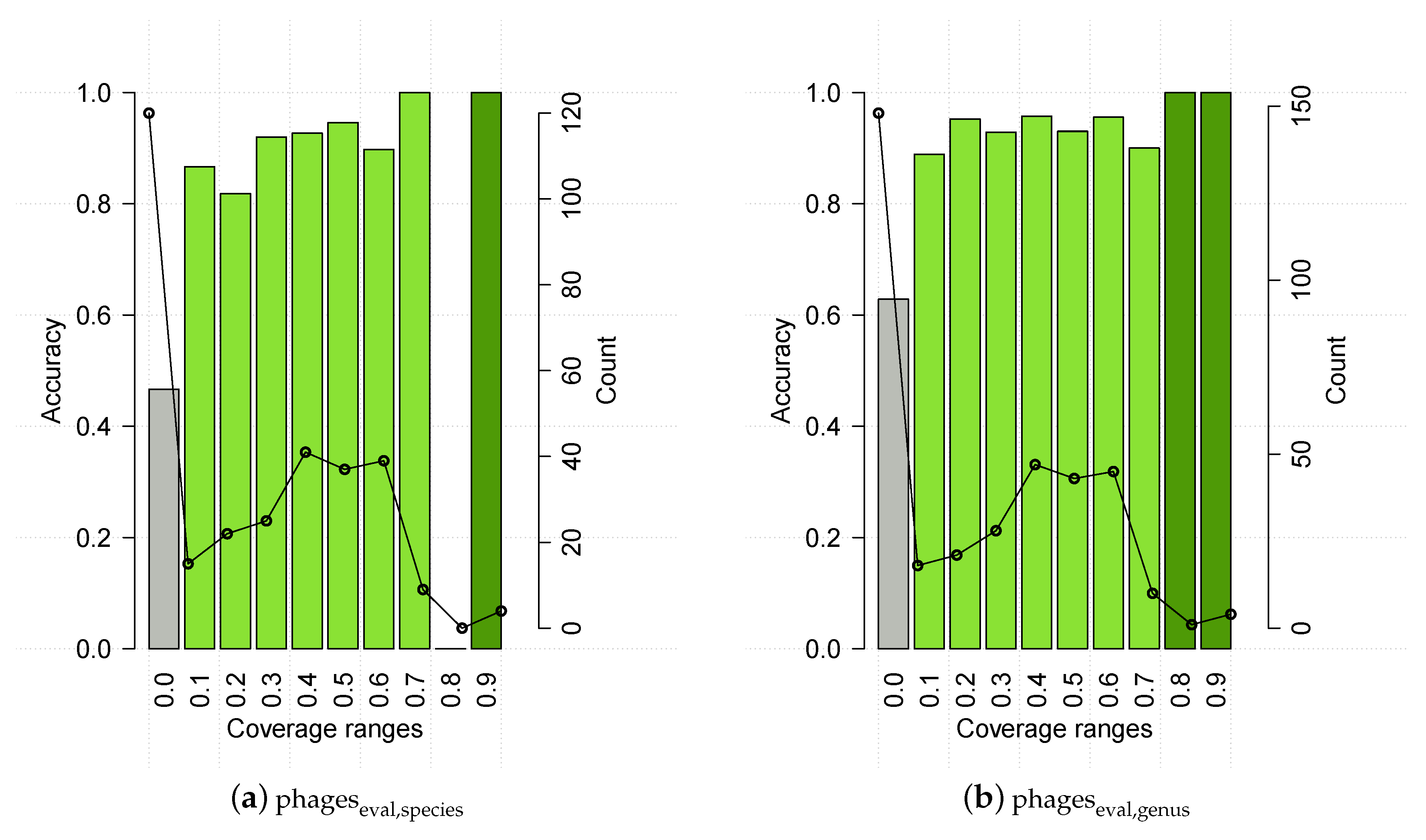 HostPhinder’s accuracy (bar) and prediction counts (line) on at different coverage ranges. The values displayed on the x axis are the lower limit of that range. With exception of the last bin which includes all entries with coverage >0.9, all ranges are right-closed with upper limit x + 0.1. Poorly reliable results are in grey, while reliable and highly reliable results are in green and dark green respectively. Results on HostPhinder’s web server [1] are displayed using the same colour code.
