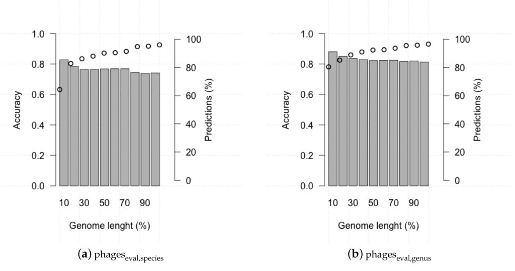 HostPhinder’s accuracy (bar) and percentages of predictions (dots) on at different percentages of genome length from 10% to 100% of total genome length.
