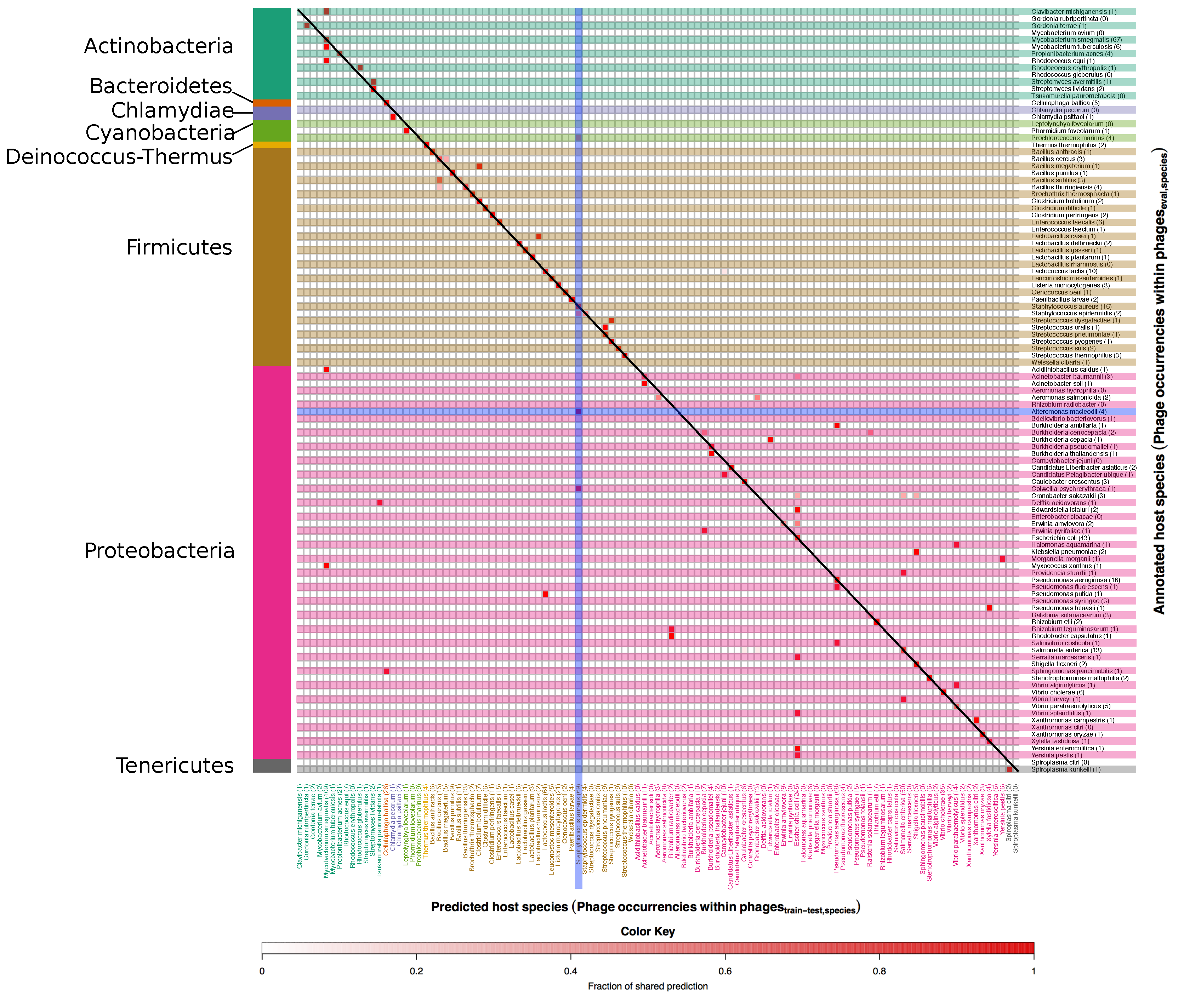 Heatmap of annotated vs. predicted host species in the set. In this figure correct as well as mispredicted host species can be seen. Annotated host species are listed along the y axis, while predicted ones are on the x axis. The number after each species on the y axis and the x axis also indicate the occurrences of phages in the and in the respectively. Host species are grouped according to the respective phylum, which are indicated on the left side of the figure. The colour scale indicates the fraction of phages predicted as targeting a particular host and goes from white, no phages, to red, 100% of the phages. Accordingly, the colour itself is not an indicator of correctness of the prediction, and red colours along the diagonal represent correct predictions.