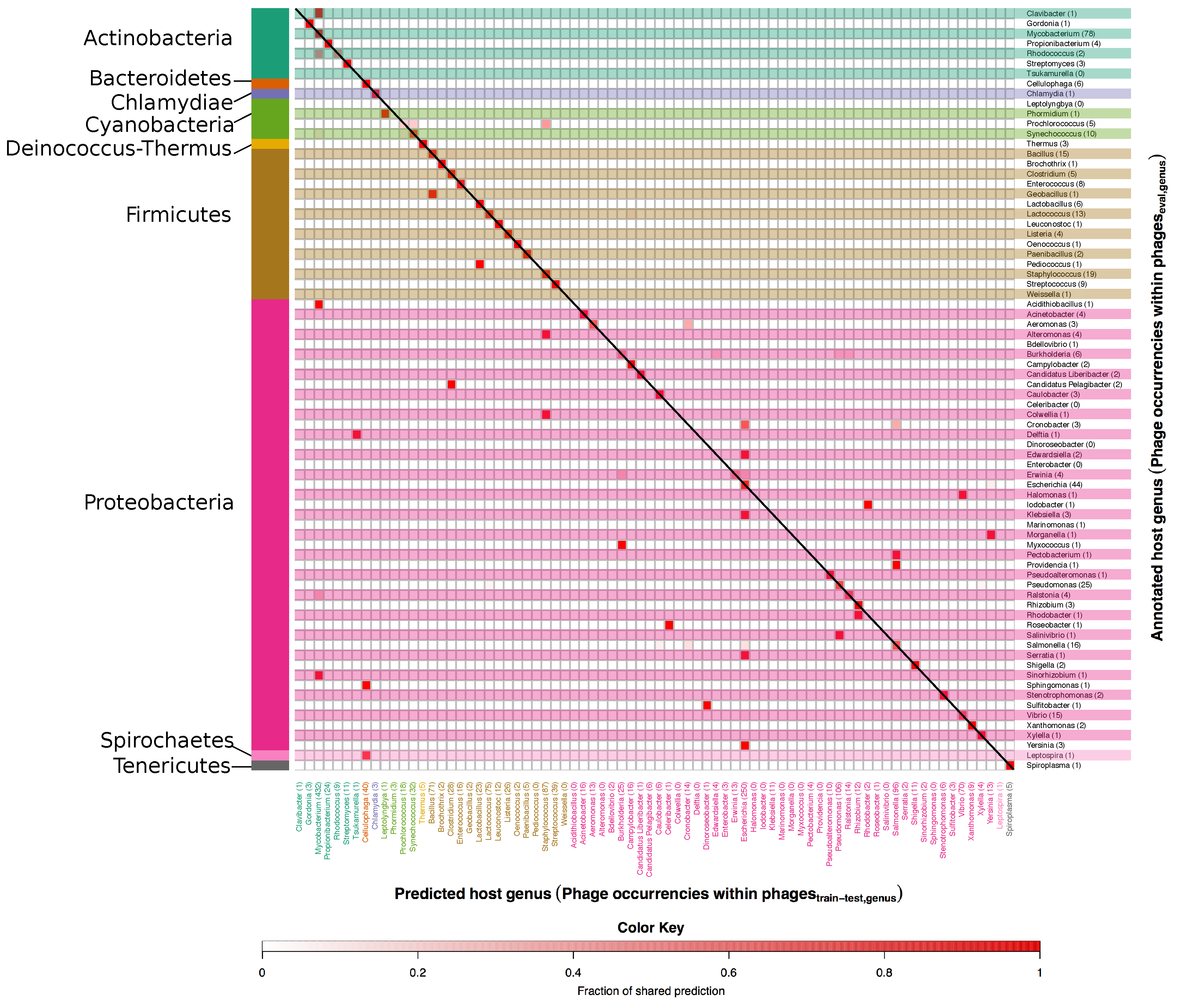 Heatmap of annotated vs. predicted host genera in the set. In this figure correct as well as mispredicted host genera can be seen. Annotated host genera are listed along the y axis, while predicted ones are on the x axis. The number after each genus on the y axis and the x axis indicate the number of occurrences of phages in the and respectively. Host genera are grouped according to the respective phylum, which are indicated on the left side of the figure. The colour scale indicates the fraction of phages predicted as targeting a particular host and goes from white, no phages, to intense red, 100% of the phages. Accordingly, the colour is in itself not an indicator of correctness of the prediction, and red colours along the diagonal represent correct predictions.