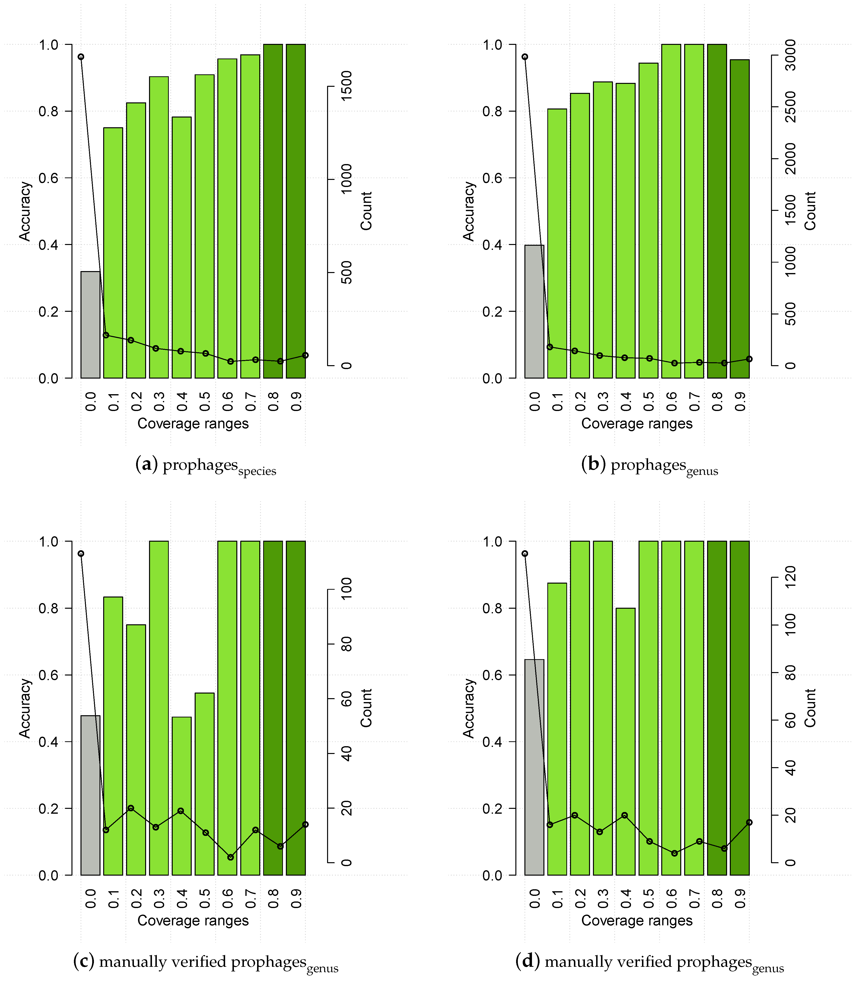 HostPhinder’s accuracy (bar) and prediction counts (line) on prophages predicted by PhySpy, upper panels, and manually verified prophages, lower panels, at different coverage ranges. The values displayed on the x axis are the lower limit of that range. With exception of the last bin which includes all entries with coverage >0.9, all ranges are right-closed with upper limit x + 0.1. Poorly reliable results are in grey, while reliable and highly reliable results are in green and dark green respectively.