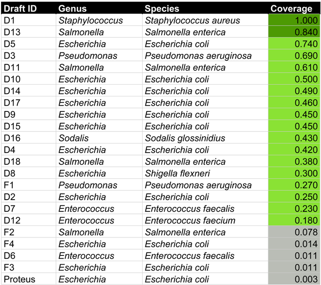 The Georgian George Eliava Institute of Bacteriophages, Microbiology and Virology has developed phage cocktails (mixtures of phages) since the 1950s. One of these, the INTESTI bacteriophage cocktail, claims to contain sterile filtrates of phage lysates effective against Staphylococcus, Enterococcus, Proteus, Shigella, Salmonella, Escherichia coli, and Pseudomonas aeruginosa for the treatment of intestinal bacterial infections. The cocktail was sequenced directly on an Illumina MiSeq platform and de novo assembled to contigs, which were further grouped into 19 draft genomes each hypothesized to represent close to complete phage genomes, and 4 smaller groups hypothesized to represent fragments of phage genomes previously described [38]. The host genus and species of each of these 23 groups was predicted by the final HostPhinder method using the 4th criterion with .