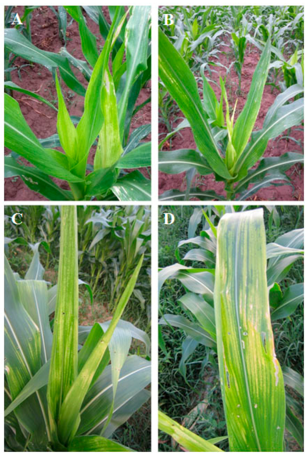 Typical yellow mosaic symptom as represented on the field maizes. Overall view of the whole plants collected from Yuanmou, Yunnan (A,B) and Changshun, Guizhou (C). (D) A closer photograph of a leaf associated with MaYMV.