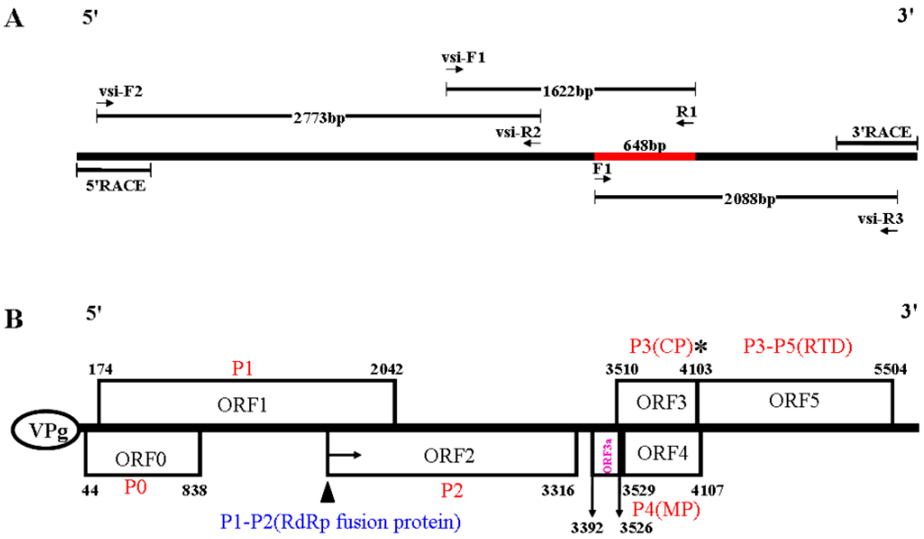 (A) Schematic diagram of MaYMV cDNA cloning strategy. The relative positions of primers and RT-PCR products are shown as arrows and line segments, respectively. Vsi designation corresponds to primers that were designed based on virus-derived siRNA sequences. The red line represents the size and position for initially validation of MaYMV by using primer pairs F1/R1; and (B) a schematic representation of the genome organization of MaYMV. The predicted frameshift heptanucleotide is marked with a filled triangle, and the “leaky” amber stop codon with an asterisk. RdRp, RNA-dependent RNA polymerase; CP, coat protein; MP, movement protein; RTD, readthrough domain.