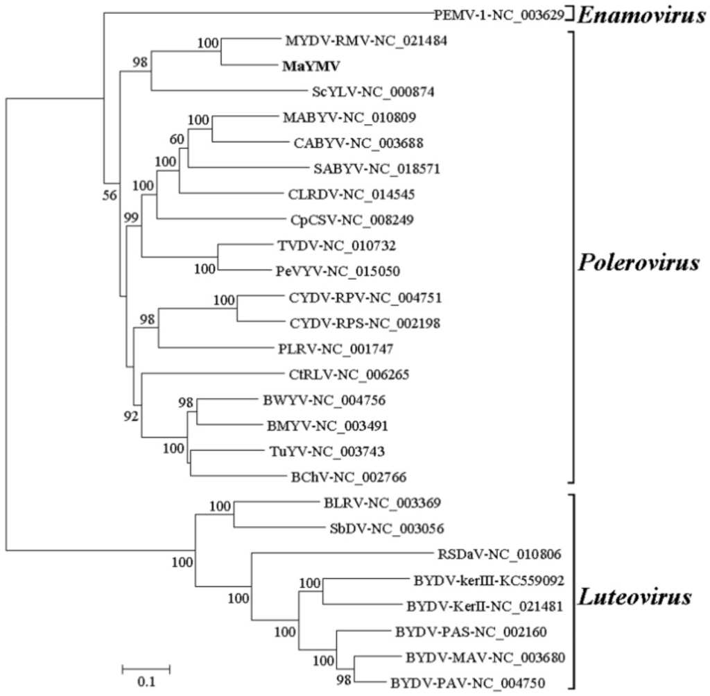 Phylogenetic analyses of MaYMV and selected luteoviruses based on complete genome sequences. The phylogenetic trees were generated using the neighbor-joining method and MEGA6 software. The percentage of replicate trees in which the associated taxa clustered together in the bootstrap test (1000 replicates) is shown next to the branches.