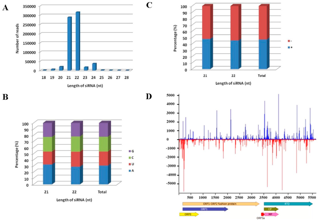 Characterization of the MaYMV vsiRNAs. (A) Size distribution of the vsiRNAs along MaYMV genome; (B) the relative frequency of the four different 5′ terminal nucleotides in vsiRNAs; (C) polarity distribution of vsiRNAs that perfectly matched either plus or minus MaYMV genomic sequence; and (D) distribution profile of the vsiRNAs that revealed multiple hotspots along the MaYMV genome.