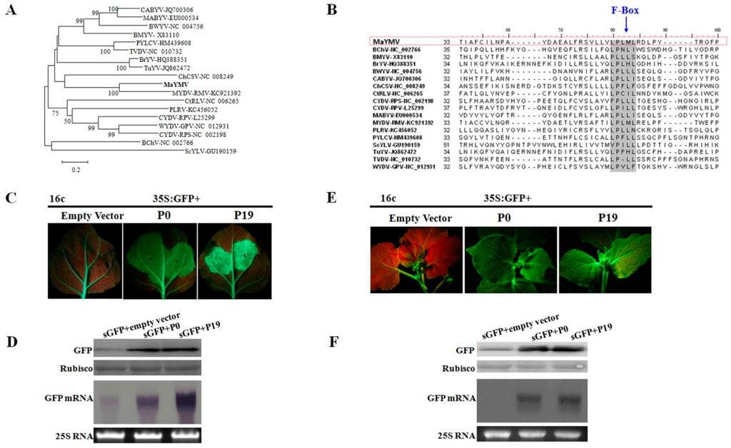 The P0 protein encoded by the 5′-terminal ORF in poleroviruses generally shows a high level of amino acid sequence variability among the members of this genus (Table 2). In particular, MaYMV P0 is most closely related to MYDV-RMV P0 with only 48% of sequence identity (Table 2). A closer examination of P0 amino acid sequences revealed conservation of the F-Box-like motif among all poleroviruses including MaYMV (Figure 5A,B) and suggesting its putative RSSs function. The local and systemic silencing suppression activity of MaYMV P0 was investigated in agro-coinfiltration assays using the 16c transgenic N. benthamiana plants. At 5 dpi, strong green fluorescence was observed in leaves co-infiltrated with 35S-GFP plus either 35S-P0 or 35S-P19. In contrast, the infiltrated areas of negative control leaves appeared as a red patch suggesting complete GFP silencing (Figure 5C). Immunoblot analysis with a GFP-specific antibody was used to validate correlation between the observed GFP fluorescence and GFP accumulation (Figure 5D). As expected, GFP was readily detected in the 35S-P0 or 35S-P19 infiltrated plants, with higher levels in the leaves tested at 5 dpi than in the leaves co-infiltrated with 35S-GFP plus empty vector. Similarly, GFP mRNA accumulated to higher levels in leaves co-infiltrated with 35S-GFP plus either 35S-P0 or 35S-P19, whereas GFP mRNA levels were remarkably reduced in negative control leaves (Figure 5D). These results indicated that the MaYMV P0 possesses RSS activity that acts at a local level.