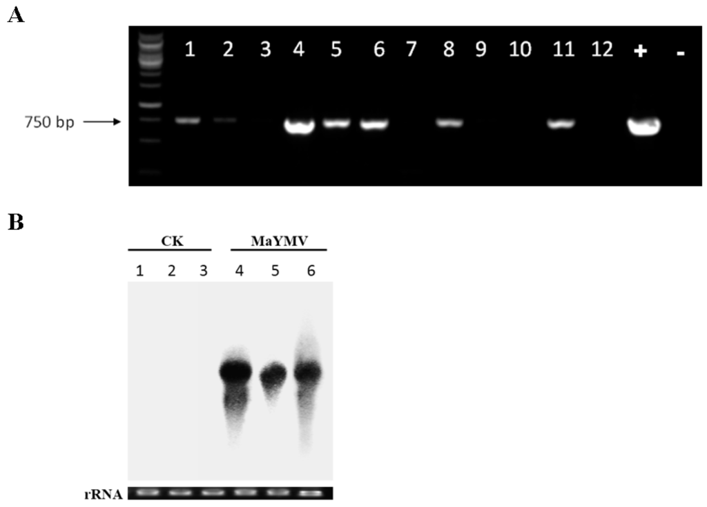 Agroinoculation infectivity assays using pCB301-MaYMV and N. benthamiana plants. (A) RT-PCR analysis of not inoculated (systemic) leaves infected by MaYMV. The numbers from 1 to 12 correspond to individual plants inoculated with pCB301-MaYMV infectious clone. “+” represents the positive control (using plasmid pCB301-MaYMV as a PCR template); “−“ represents the negative control (using the cDNA from mock-inoculated N. benthamiana as a PCR template); and (B) Northern blot analysis of MaYMV RNA obtained from pCB301-MaYMV-agroinoculated upper leaves of plants and the MaYMV CP ORF-derived cDNA probes. Equal loading of total RNA (20 μg) was validated by ethidium bromide-stained agarose gels as indicated at the bottom of the panel. Numbers 1–3 correspond to the replicates of the negative control; numbers 4–6 are the replicates of samples from plants agro-inoculated with pCB301-MaYMV.