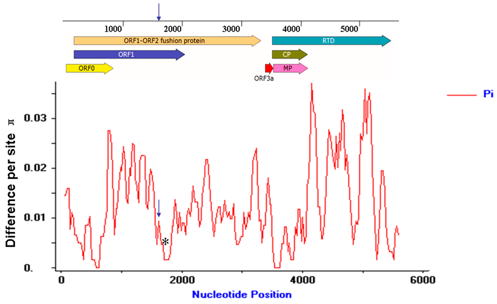 Distribution of MaYMV genetic variation estimated by nucleotide diversity (π). The sliding window was 100 sites wide with slide set at 25-site intervals. The relative positions of the seven ORFs of the MaYMV genome are illustrated by lines above the plot. The positions of conserved frameshifting sequence and pseudoknot sequences are shown as blue arrow and black asterisks, respectively.