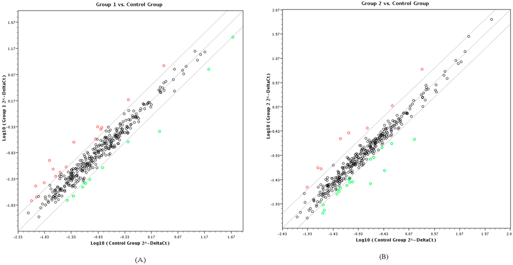Scatter plot of differentially expressed miRNAs generated from QIAGEN web-based polymerase chain reaction (PCR)-array data analysis software. Group 1 represents human immunodeficiency virus (IV)-1 infected peripheral blood mononuclear cells (PBMC), Group 2 represents HIV-2 infected PBMC and control group represents mock infected (no virus) PBMC. Plot shows the microRNA (miRNA) expression in (A) HIV-1 infected PBMC vs. control PBMC and (B) HIV-2 infected PBMC vs. control PBMC. Red (o) circles represent upregulated and green (o) circles represent down regulated miRNAs with an expression level of greater than 2 fold upregultaion or downregulation respectivelly.