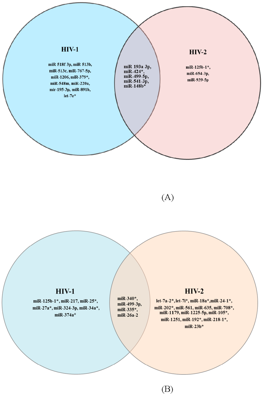 Venn diagram of differentially expressed miRNAs generated from QIAGEN web-based PCR-array data analysis software illustrating the overlap of upregulated or down regulated miRNAs between HIV-1 infected PBMC vs. control and HIV-2 infected PBMC vs. control. (A) Sixteen miRNAs showed greater than 2 fold upregulation in HIV-1 infected PBMC, whereas eight miRNAs showed upregulation in HIV-2 infected PBMC. Five miRNAs (miR-193a-3p, miR-424*, miR-499-5p, miR-541-3p and miR-148b*) were commonly upregulated in both HIV-1 and HIV-2 infected PBMC; (B) Eleven miRNAs demonstrated less than 2 fold downregulation in HIV-1 infected PBMC cells and nineteen miRNAs demonstrated less than 2 fold downregulation in HIV-2 infected PBMC cells respectively. Only four miRNAs (miR-340*, miR-499-3p, miR-335* and miR-26a-2) were commonly downregulated in both HIV-1 and HIV-2 infected PBMC cells.
