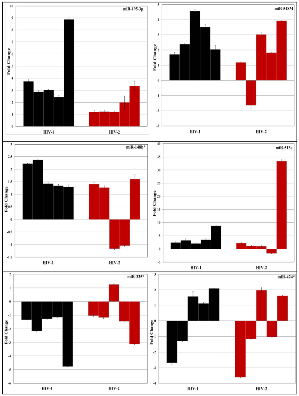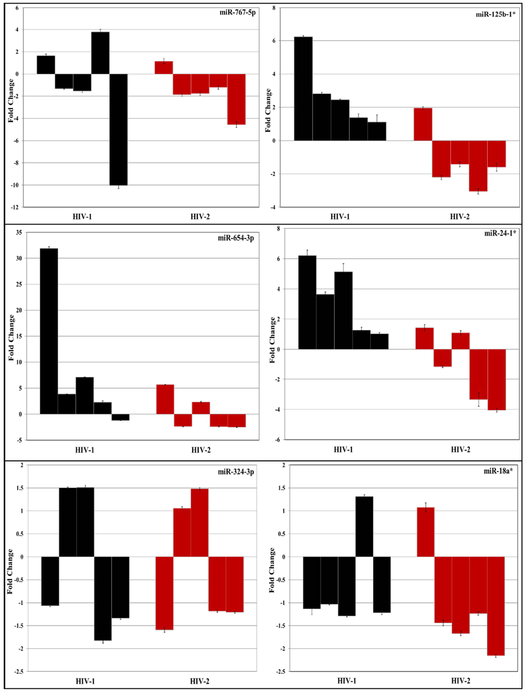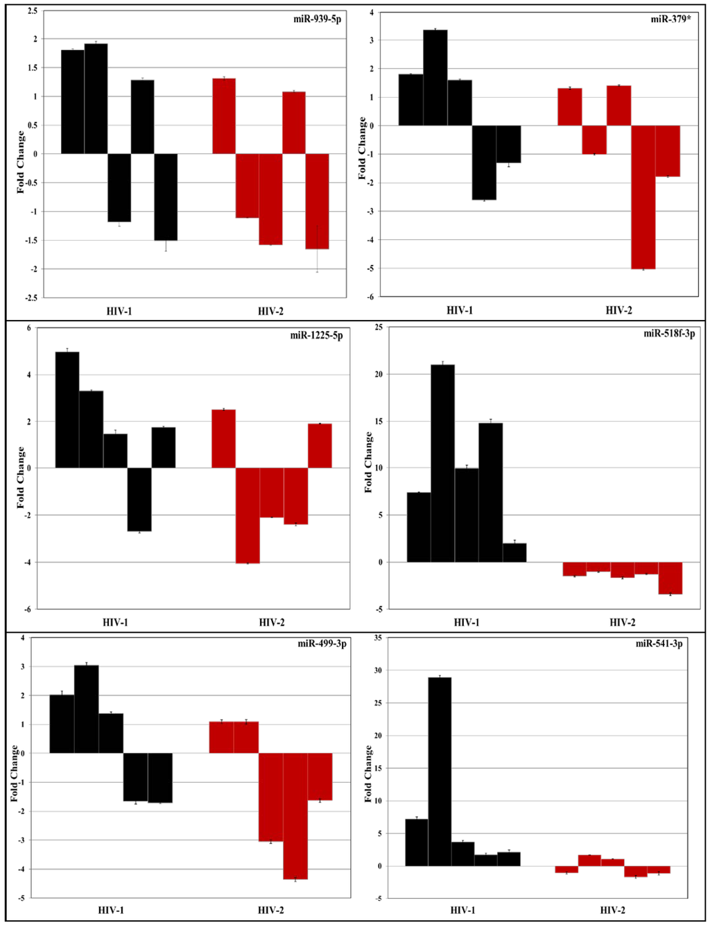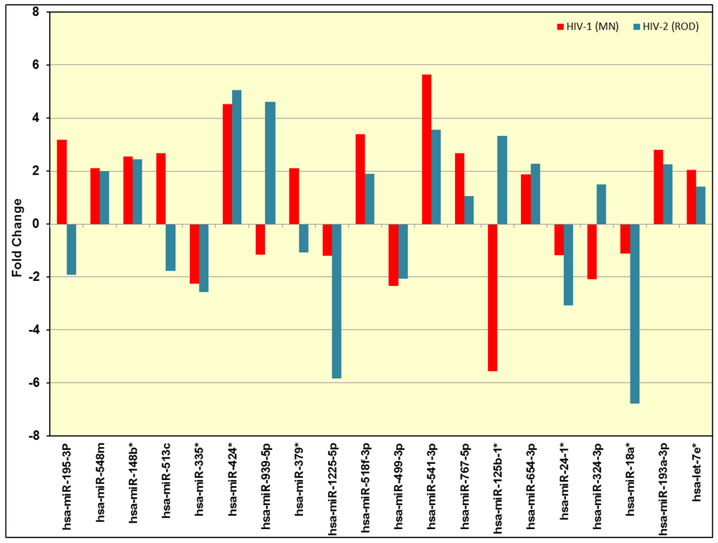 HIV infection induces multiple changes in the expression profile of host genes including non-coding RNA species, all of which contribute to host response. In order to delineate the differences in virus- host responses to infection with HIV-1 or HIV-2, we wanted to characterize the expression profiles of host miRNAs in cells infected with HIV-1 and HIV-2. Thus, the differential expression of host miRNA expression profiles was analyzed using the miRNA profiling PCR arrays.