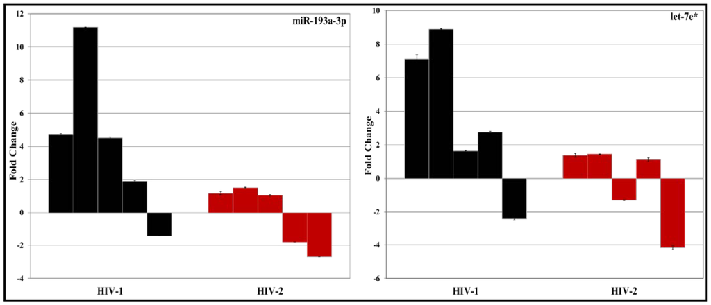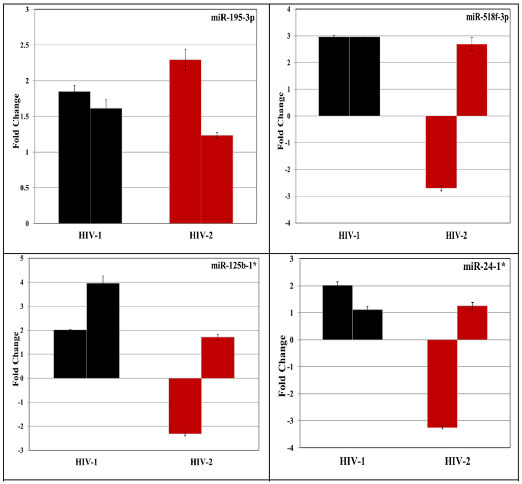The results indicate that five miRNAs are commonly upregulated in both HIV-1 and HIV-2 infected cells and four miRNAs were commonly downregulated in both HIV-1 and HIV-2 infected cells. Out of the 45 differentially expressed miRNAs (Table 2), 20 differentially expressed miRNAs in HIV-1 and HIV-2 infected cells were selected for further analyses (Figure 3).