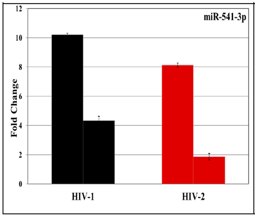 Results indicate that among the twenty differentially expressed miRNAs tested, only nine miRNAs (hsa-miR 193a-3p, hsa-miR 195-3p, hsa-miR 499-3p, hsa-miR 518f-3p, hsa-miR 541-3p, hsa-miR 654-3p, hsa-miR 125b-1*, hsa-miR 24-1* and let-7e*) showed consistent differential expression by independent RT-PCR assay (Figure 4). This could be due to the donor to donor variation. The results obtained from five independent PBMCs infected with HIV-1 and HIV-2 indicates that these miRNAs are differentially regulated across multiple donors in response to infection by HIV-1 or HIV-2. Using RNA isolated from two independent sets of Jurkat cells infected with HIV-1 and HIV-2 (Figure 5) as the template we identified three miRNAs (hsa-miR 195-3p, hsa-miR 518f-3p, and hsa-miR-541-3p) that were consistently upregulated in HIV-1 infected cells. This result is in agreement with our previous RT-PCR results obtained from PBMC, further validating the reproducibility of our PCR array analyses.