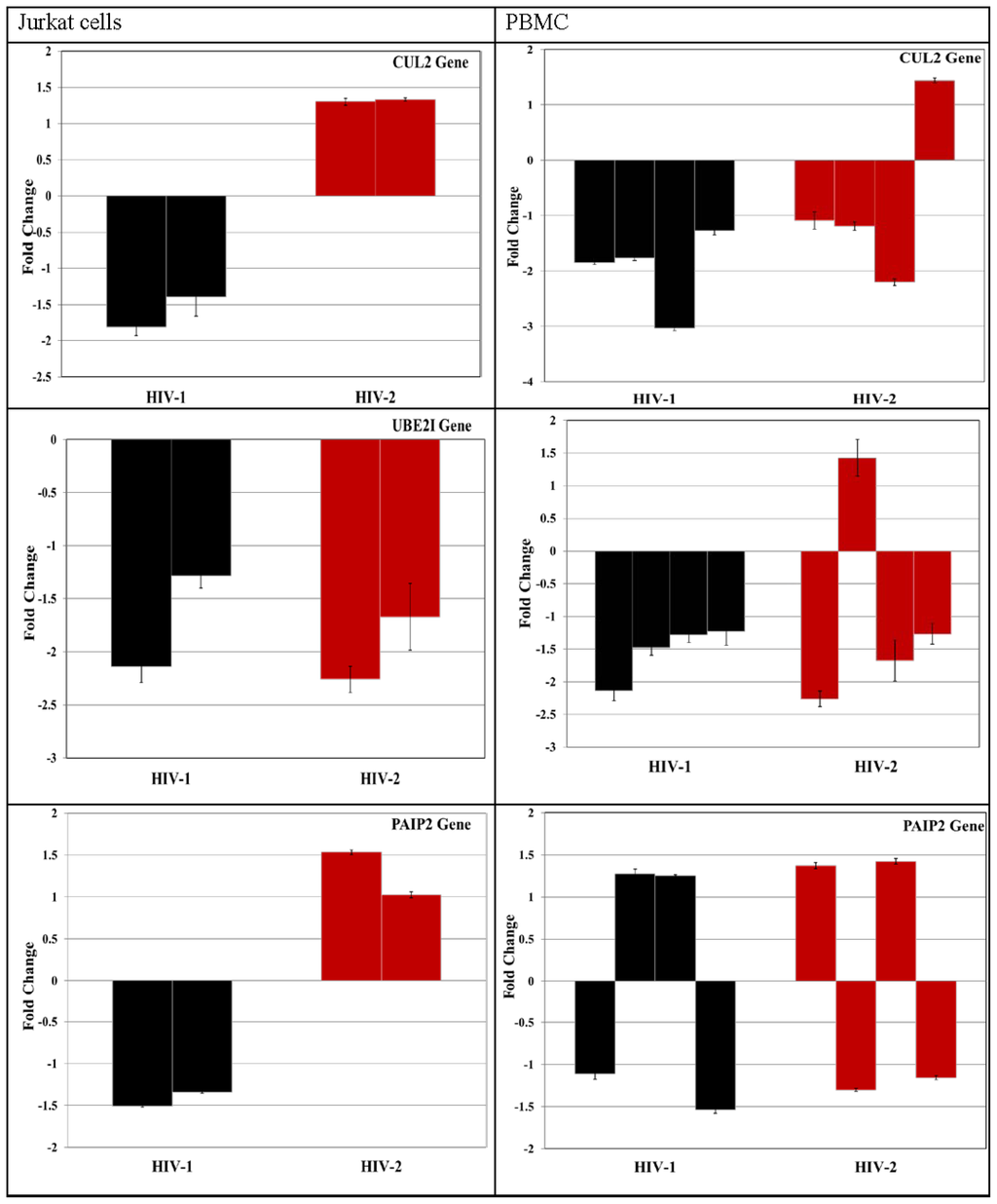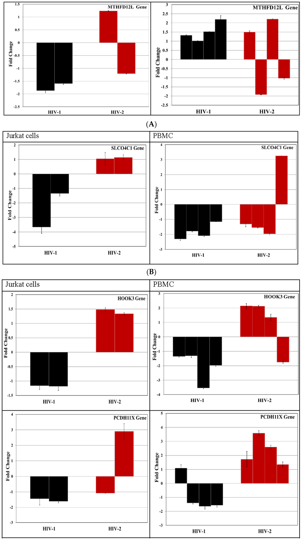 Validation of (A) miR-195-3p-miRNA host gene; (B) miR-518f-3p miRNA host gene; (C) miR-541-3p miRNA host gene targets by RT-PCR in two independent sets of Jurkat cells and PBMC isolated from four independent donors, infected with HIV-1 and HIV-2. The relative expression of the target genes were measured by RT-PCR. Data was analyzed using 2−∆∆Ct method and results were plotted as fold difference of relative expression normalized to the glyceraldehyde-3-phosphate dehydrogenase (GAPDH) gene. Results expressed as mean ± SEM of all independent donors’ experiments.