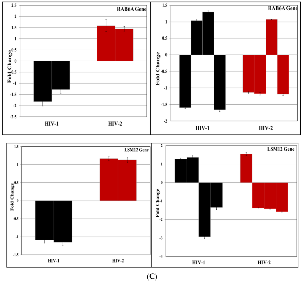 - Devadas, K.; Biswas, S.; Haleyurgirisetty, M.; Wood, O.; Ragupathy, V.; Lee, S.; Hewlett, I. Analysis of host gene expression profile in HIV-1 and HIV-2 infected T-cells. PLoS ONE 2016, 11, e0147421. [Google Scholar] [CrossRef] [PubMed]