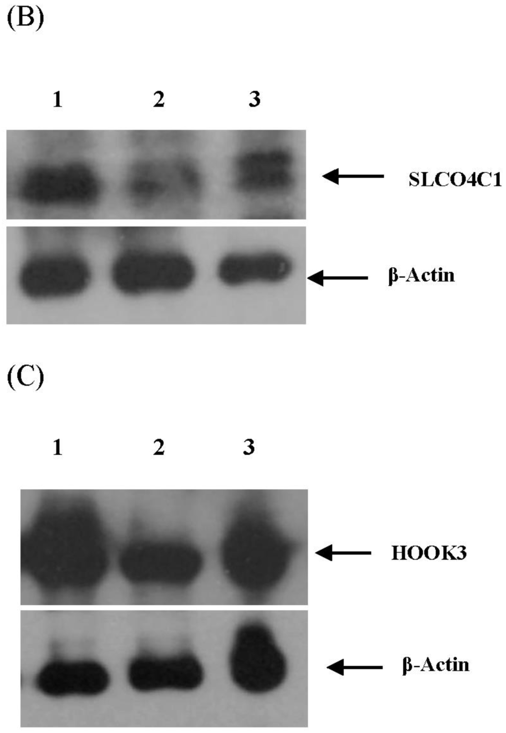 Protein expression validation of (A) miR-195-3p-miRNA target host gene CUL-2; (B) miR-518f-3p miRNA target host gene solute carrier organic anion transporter family member 4C1 (SLCO4C1); (C) miR-541-3p miRNA target host gene hook microtubule-tethering protein 3 (HOOK3) by Western blot in PBMC infected with HIV-1 and HIV-2. Lane 1 is denoted as no virus infection control, Lane 2 is denoted as HIV-1 (MN) infected PBMC and Lane 3 is denoted as HIV-2 (ROD) infected PBMC respectively. The data is representative of three independent experiments.