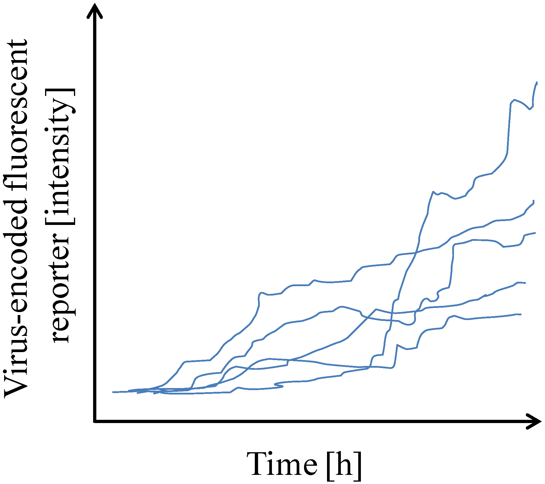 Single cells display cell-to-cell variability in gene expression. Graph plot showing the expression of a virus-encoded fluorescent reporter over time post-infection as quantified by time-lapse microscopy. (Adapted from [21]).