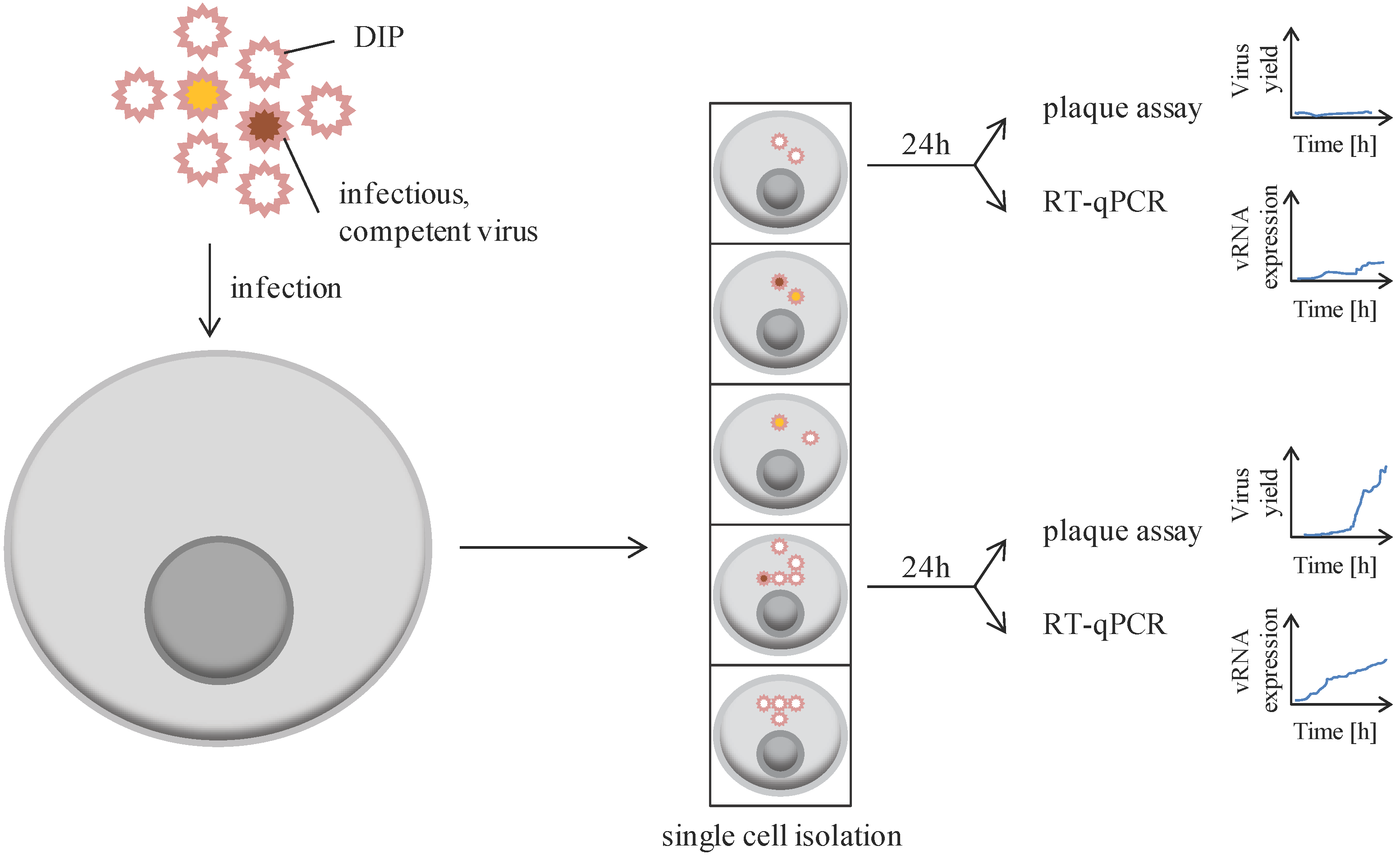 Single cells display cell-to-cell variability in infectious viral progeny. Cells are infected at a determined multiplicity of infection, usually represented by a virus aggregate containing infectious (colored) and defective particles (empty, defective interfering particles, DIP). The genomic sequence of infectious, competent viruses may vary among viral particles, represented here by a yellow and a red particle. After infection, cells are separated and grown for 24 h. Cells are then collected for assessing specific gene expression (usually viral RNA) by RT-qPCR, while supernatants are collected to perform plaque assay for infectious titer determination.