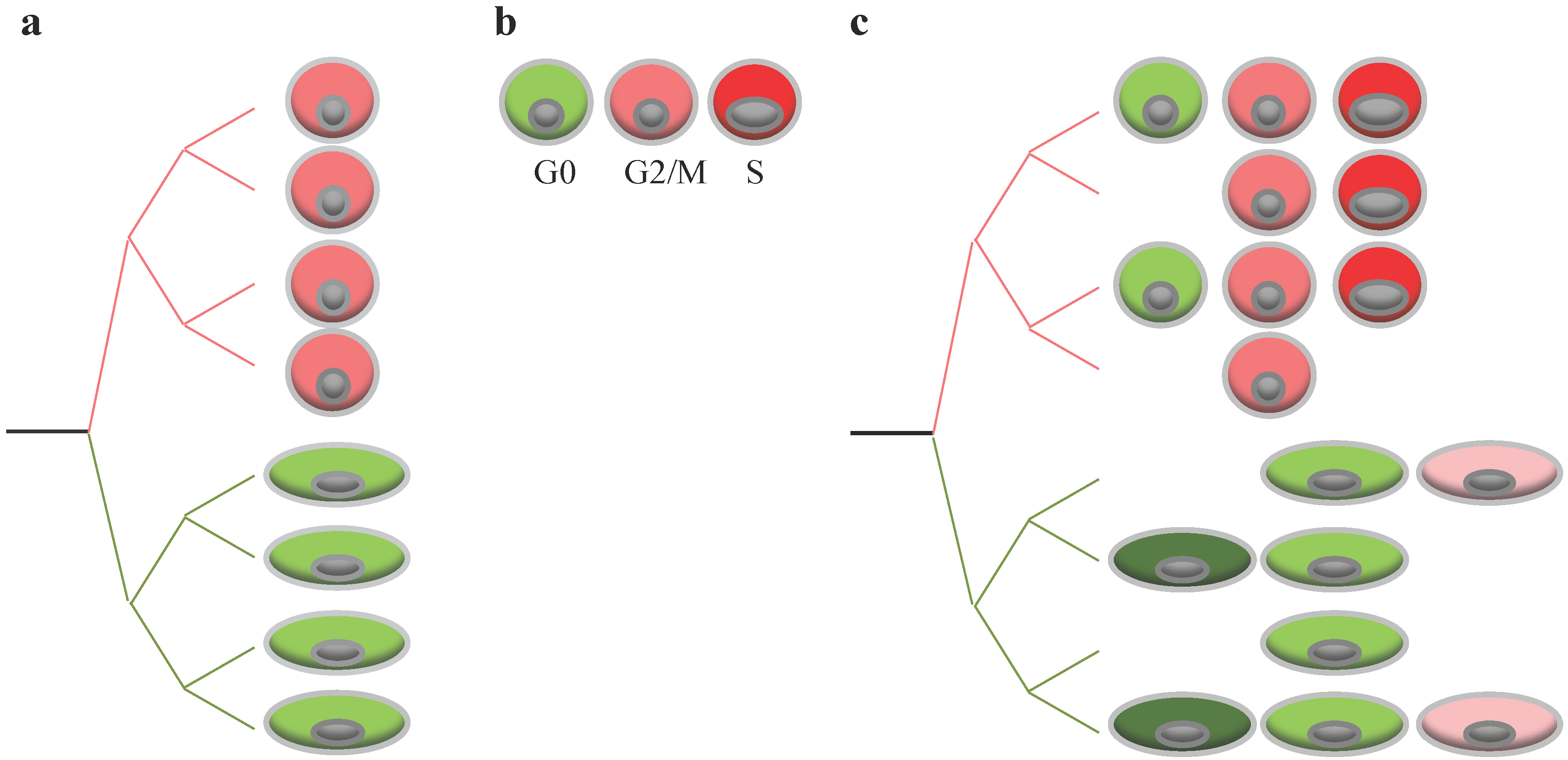Single cell analysis and impact of cell-to-cell variability on virus replication. (a) Cell population may contain multiple cell subsets, displaying high (red) and low (green) susceptibility to viral replication; (b) cell population may contain cells in different states (differentiation, cell cycle), affecting their susceptibility to viral infection. For example, cells in the S phase might display high levels of susceptibility to viral infection (red) while cells in G0 a low susceptibility to infection (green); and (c) complexity of cell population when cellular heterogeneity is a mixture of cells of multiple subsets, in multiple states, and in different proportions.