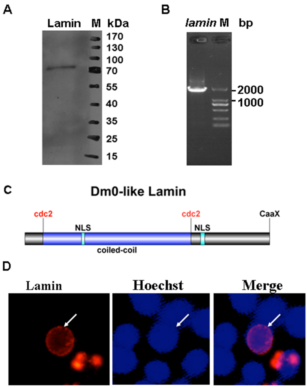 The expression and bioinformatic analysis of lamin in Sf9 cells. (A) The total protein was extracted from Sf9 cells, subjected to sodium dodecyl sulfate polyacrylamide gel electrophoresis (SDS-PAGE), and transferred to a polyvinylidene fluoride (PVDF) membrane. The protein was detected with an anti-Dm0 monoclonal antibody, ADL67, and the bound antibody was detected with an HRP-labeled secondary antibody. The protein sizes are indicated on the right. (B) Total RNAs were isolated from Sf9 cells, and the RNA samples were treated with RNase-free DNase I. The first-strand cDNA was synthesized by reverse transcription using 2 μg total RNAs as template. The cDNA mixtures were amplified by KOD polymerase using lamin-specific primers. The approximate molecular size in bp is shown. (C) The predicted structure of Sf9 cell lamin. The lamins have a central coiled-coil domain (blue box) flanked by short head and long tail domains. The coiled-coil domain is flanked by cdc2 phosphorylation sites. Two NLSs were predicted in the coiled-coil domain and the tail domain. The CaaX motif is in the C-terminal. (D) Sf9 cells were transfected with pIZ-rfp-lamin plasmids to show the sub-cellular distribution of lamin. The nucleus was stained with Hoechst 33258 (blue) at 48 h p.t., and the lamin expression (red) was observed by fluorescence microscopy.