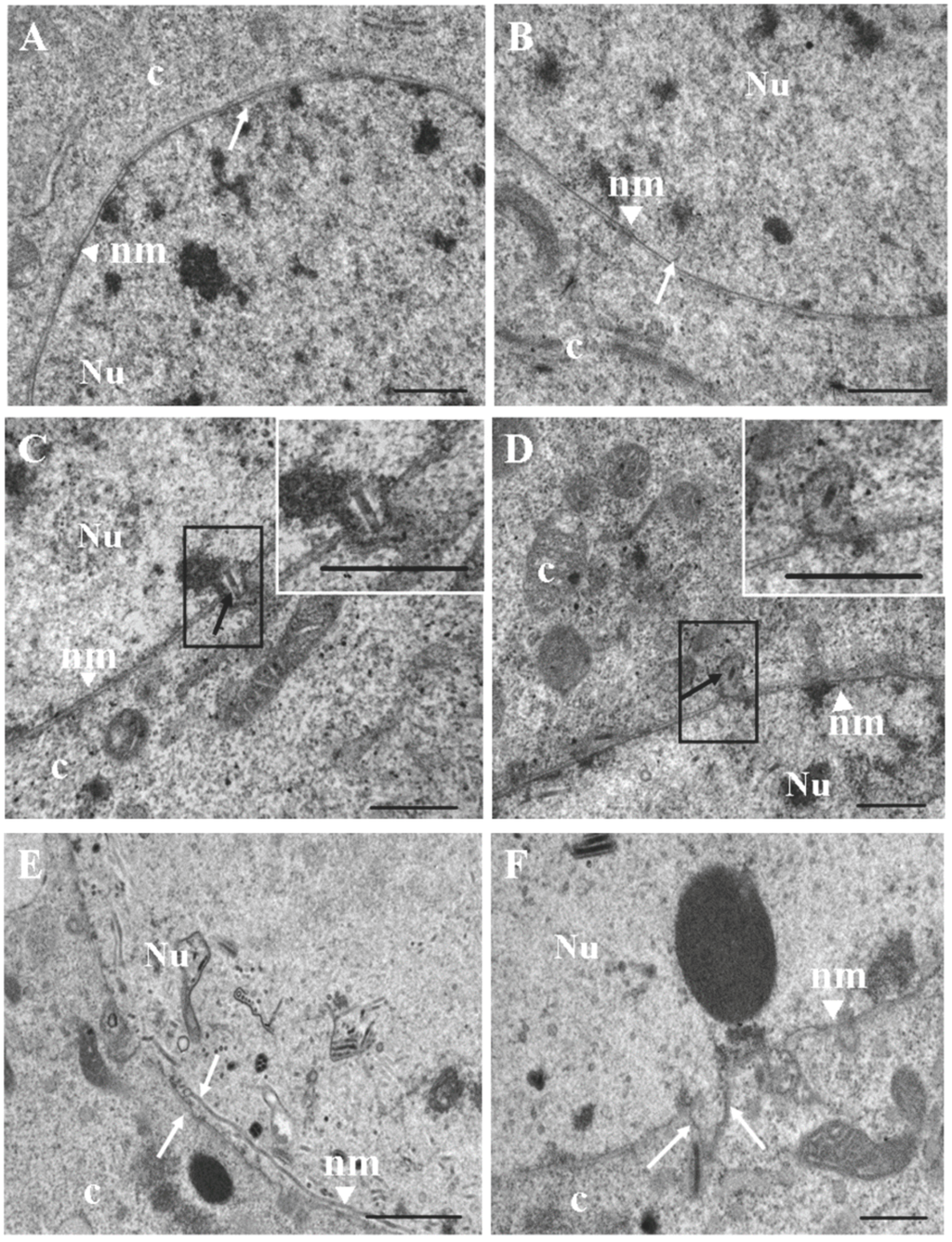 Electron microscopy of vAcBac-infected Sf9 cells. Panels (A) and (B) show the intact nuclear membrane in mock-infected cells and cells at 12 h post-infection (p.i.), respectively. The white arrows indicate the nuclear membrane. Panels (C) and (D) show the egress of nucleocapsids from the nuclear membrane at 24 h p.i. Inset shows the boxed region at higher magnification. The black arrows indicate the egress of progeny viral nucleocapsids from the nuclear membrane. Panel (E) and (F) show the remodeled nuclear membrane at 48 h p.i.. The white arrows indicate variation within the nuclear membrane. Bar, 500 nm (A,B,C,D,F), and 1000 nm (E). Nu, nucleus; c, cytoplasm; nm, nuclear membrane.