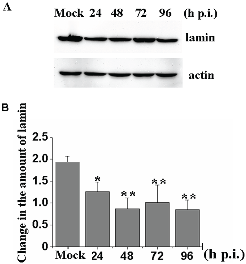 To determine whether the total amount of lamin in Sf9 cells changes during baculovirus infection, vAcBac-infected cells were examined by Western blotting assays using the ADL67 antibody. The results indicate that throughout the progression of viral infection (24, 48, 72, 96 h p.i.), the total amount of lamin was significantly decreased compared with the amount in mock-infected cells (F = 9.163, p = 0.002) (Figure 3A,B).