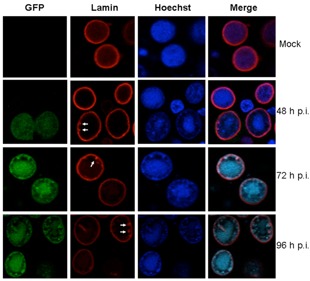 - Camozzi, D.; Pignatelli, S.; Valvo, C.; Lattanzi, G.; Capanni, C.; Dal Monte, P.; Landini, M.P. Remodelling of the nuclear lamina during human cytomegalovirus infection: Role of the viral proteins pUL50 and pUL53. J. Gen. Virol. 2008, 89, 731–740. [Google Scholar] [CrossRef] [PubMed]