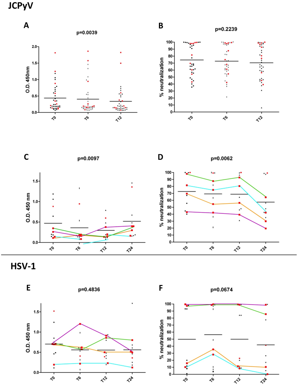 Scatterplots of the serum reactivity and neutralizing activity at different natalizumab infusion time points. The serum reactivity in ELISA against JC polyomavirus (JCPyV)/VP1 (A) and the corresponding anti-JCPyV neutralizing activity (B) are reported for all the 38 patients at baseline (T0), and after six (T6) and 12 (T12) monthly natalizumab infusions. The same parameters for the 11 patients followed up to 24 infusions (T24) are reported in (C) and (D); for these patients the serum reactivity in ELISA against HSV-1 viral particles (E) and the anti-HSV1 neutralizing activity (F) are also reported. The average values at each time point are depicted as black horizontal bars, and the resulting p values calculated by Friedman test are reported. All previously mitoxantrone-treated patients are marked with a red square (). The four patients with at least a 20% decrease of anti-JCPyV neutralizing activity between T0 and T24 are reported as colored lines; interestingly, the light blue-marked patient developed progressive multifocal leukoencephalopathy (PML) during natalizumab treatment (after the 34th natalizumab infusion). It is important to realize that none of the patients underwent plasma exchange therapy.