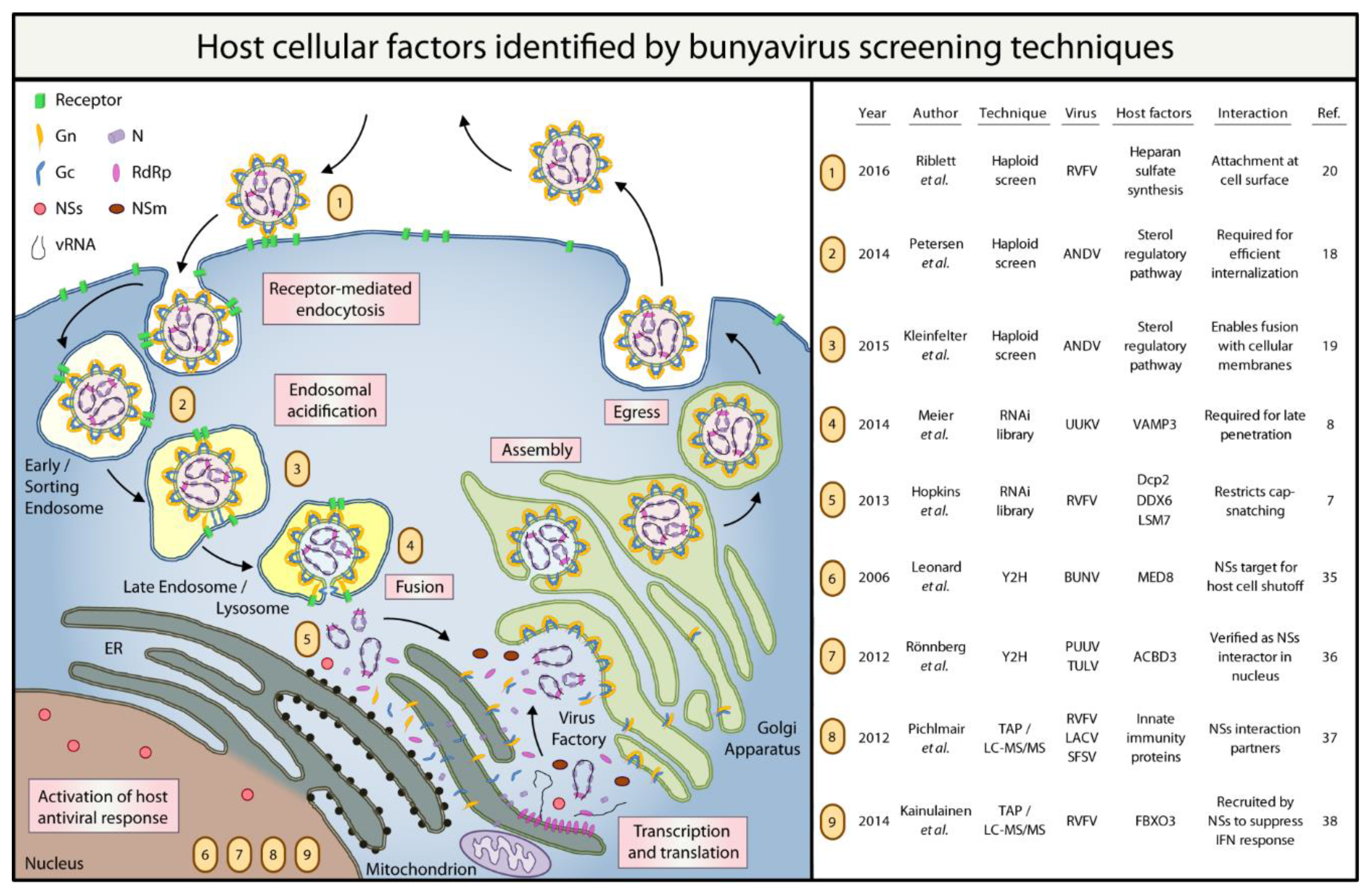 Riblett, A.M.; Doms, R.W. Making Bunyaviruses Talk: Interrogation Tactics to Identify Host Factors Required for Infection. Viruses 2016, 8, 130. https://doi.org/10.3390/v8050130
