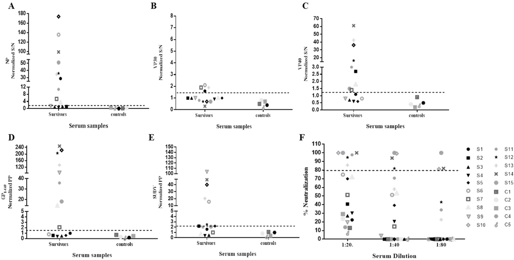 Figure 1. Summary of serological immune-reactivity and plaque reduction neutralization tests (PRNT80) of SUDV survivors and non-infected controls. (AE) Serum samples from 15 SUDV survivors and 6 non-infected controls were tested by ELISA against individual recombinant SUDV viral proteins NP (A), VP30 (B), VP40 (C) and GP1-649 (D) as well as irradiated SUDV whole virus (E). Individual cut-off values for each tested viral protein or irradiated whole antigen is presented (dashed line). (F) Dilutions of serum samples (20, 40 and 80 fold) collected from SUDV survivors and uninfected controls were assayed for their ability to neutralize live SUDV in vitro under BSL4 conditions. The cut off value for the PRNT80 assay is denoted by the dashed line. S/N = Signal to Noise. PP = Positive percentage. S—SUDV survivor. C—Non-infected control. Percentage of neutralization is expressed as: 100 − [100 × (number of SUDV plaques obtained at given serum dilution/number of control SUDV plaques)].